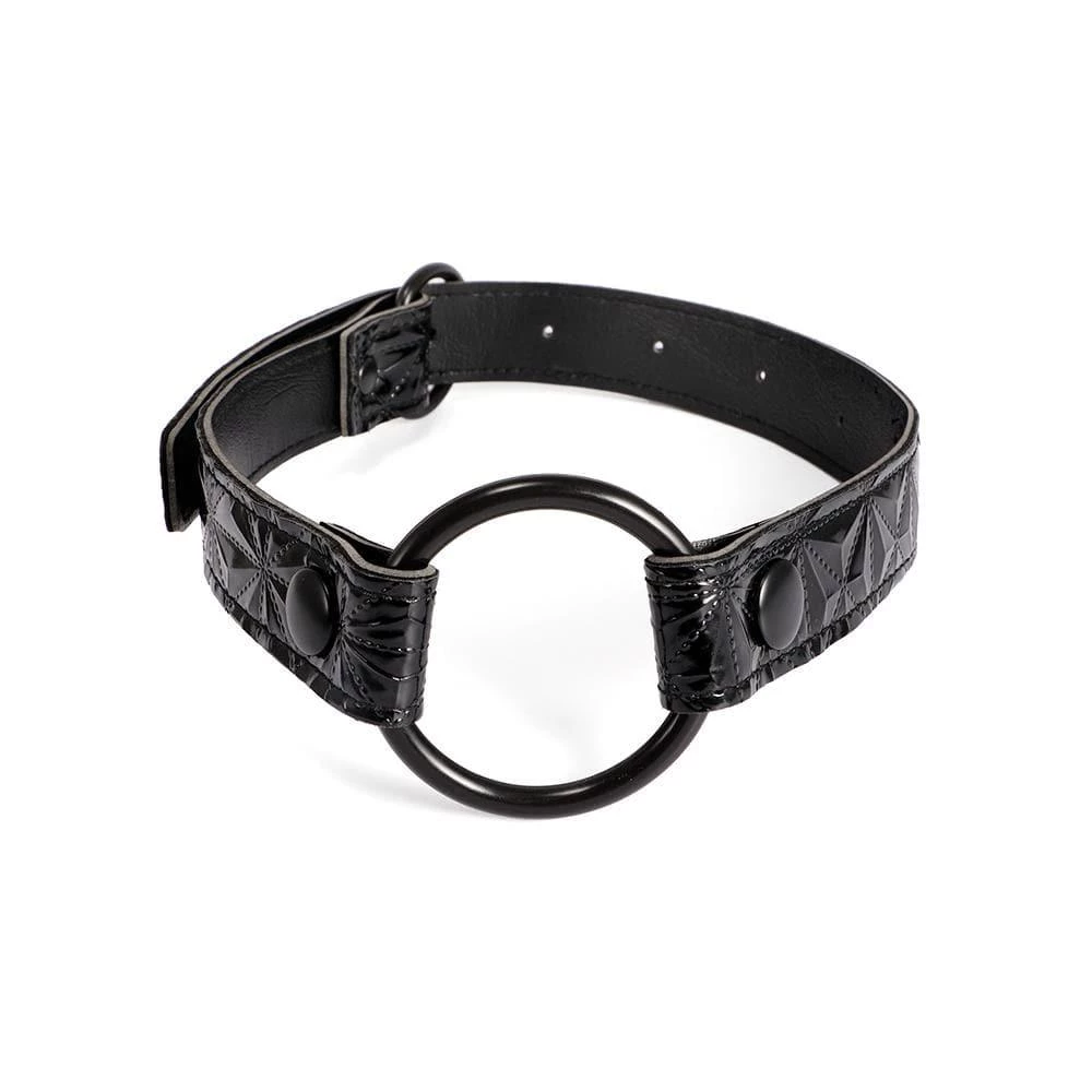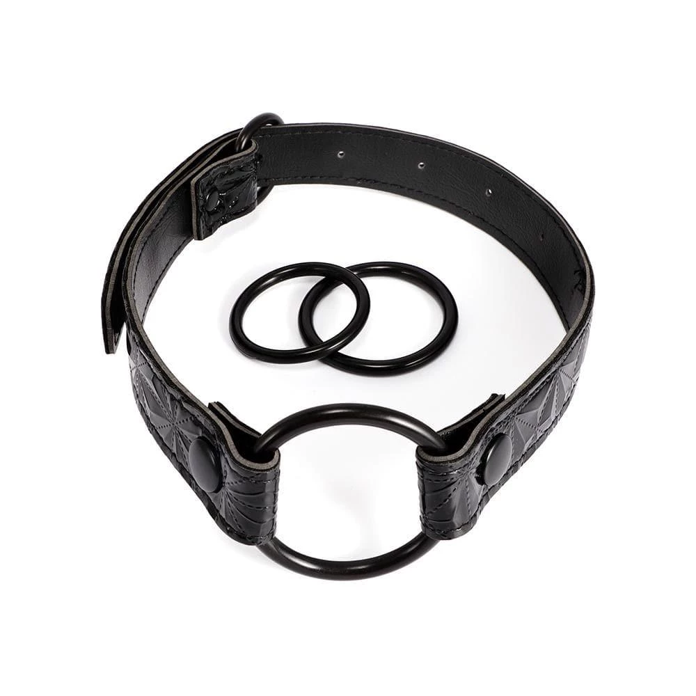 Deliciously luxurious and adjustable gag designed for secure restriction. Make your partner open up for playtime with the rigid o-ring. The vinyl construction is fully adjustable with a buckled closure, and comes with three different o-ring sizes to customize your play to the perfect size! Communication with your play partner is essential! Always use restraints with consent.