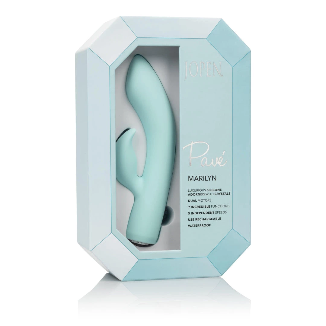 The marvelous Pavé Marilyn is a dual motor rabbit massager with dazzling crystal adornments, flexible body, and 35 sensational vibration settings for a truly one-of-a-kind pleasure experience.